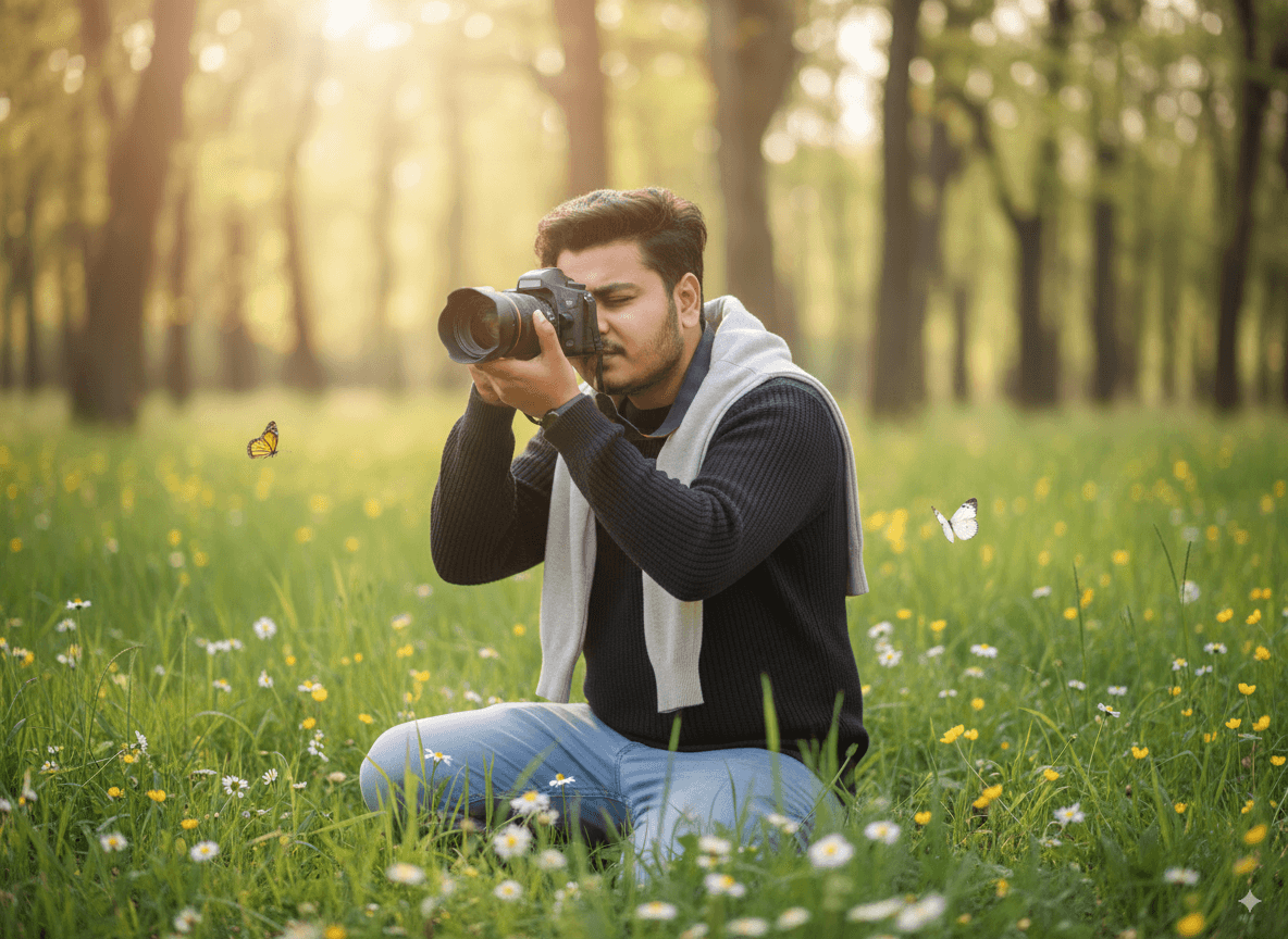 Cinematic Forest Portrait: Photographer in a Dreamlike Meadow