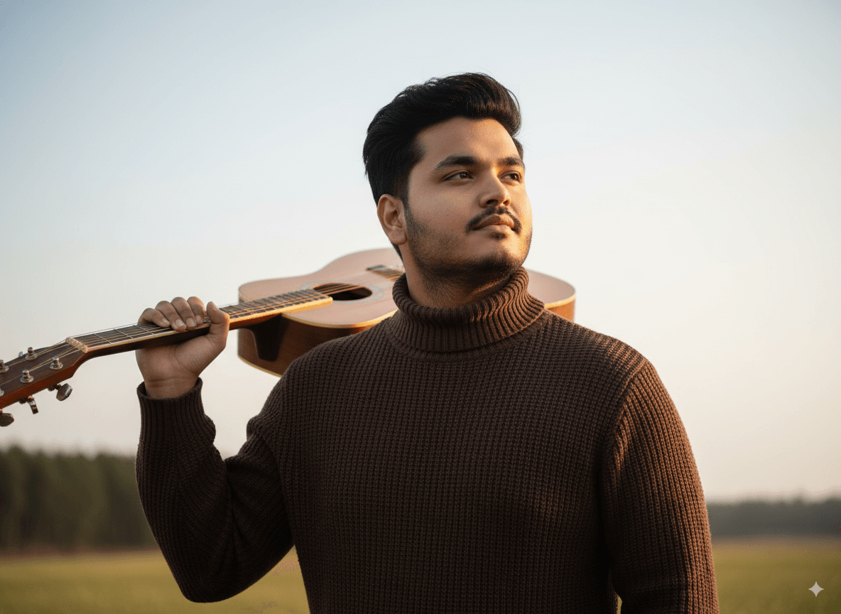 Cinematic Portrait with Acoustic Guitar: Outdoor Elegance Gemini Prompt
